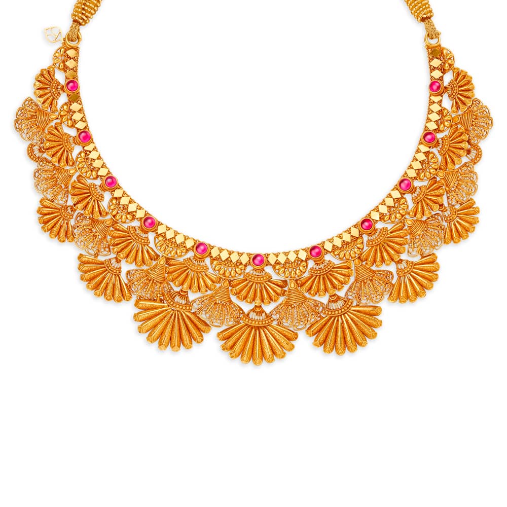 Floral design in filigree work with studded precious stones, this choker necklace is crafted in 22 Karat Yellow Gold for all Indian Brides